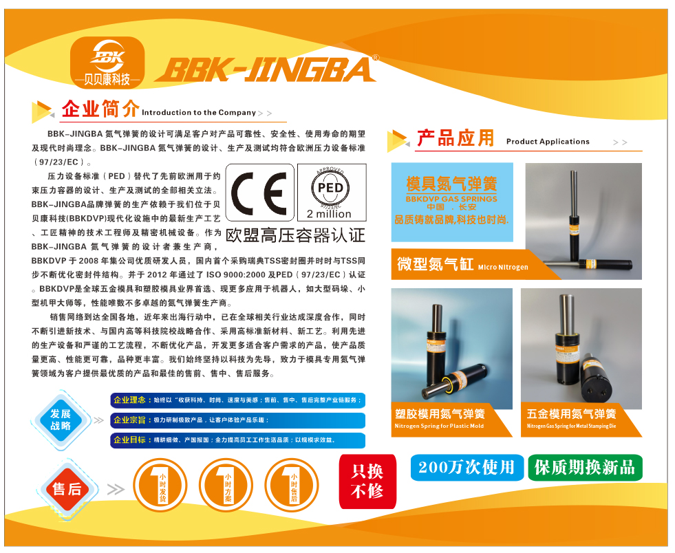 压力设备标准(PED)替代了先前欧洲用于约束压力容器的设计、生产及测试的全部相关立法。BBK-JINGBA品牌弹簧的生产依赖于我们位于贝贝康科技(BBKDVP)现代化设施中的最新生产工艺、工匠精神的技术工程师及精密机械设备。作为欧盟高压容器认证BBK-JINGBA 氮气弹簧的设计者兼生产商,BBKDVP 于2008 年集公司优质研发人员,国内首个采购瑞典TSS密封圈并时时与TSS同步不断优化密封件结构。并于 2012 年通过了 ISO 9000:2000 及PED(97/23/EC)认证BBKDVP是全球五金模具和塑胶模具业界首选、现更多应用于机器人,如大型码垛、小型机甲大师等,性能唯数不多卓越的氮气弹簧生产商。