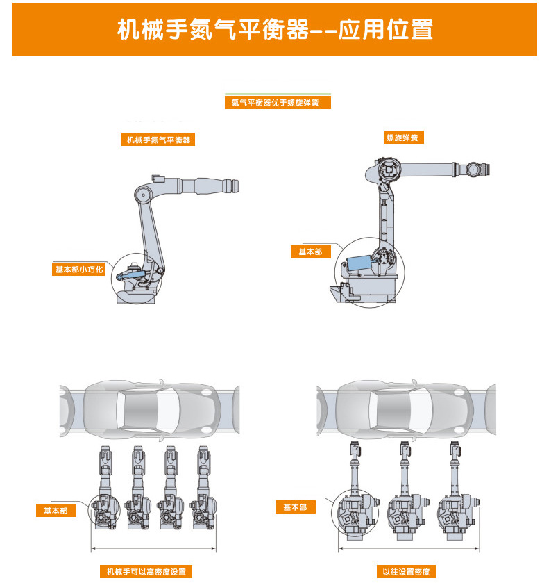 国外相关应用品牌:一是机器人整机品牌,像ABB、库卡、发那科、安川、川崎等,其码垛机器人常搭载氮气弹簧平衡器,例如川崎CP180L机器人就配有氮气平衡系统;二是氮气弹簧平衡器配件品牌,如美国的HYSON,旗下HYSON3024926型号氮气平衡杠,因耐用、适配性广,常作为上述机器人品牌的配件,但结构过于复杂,安装不方便。